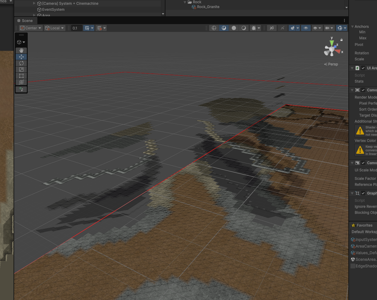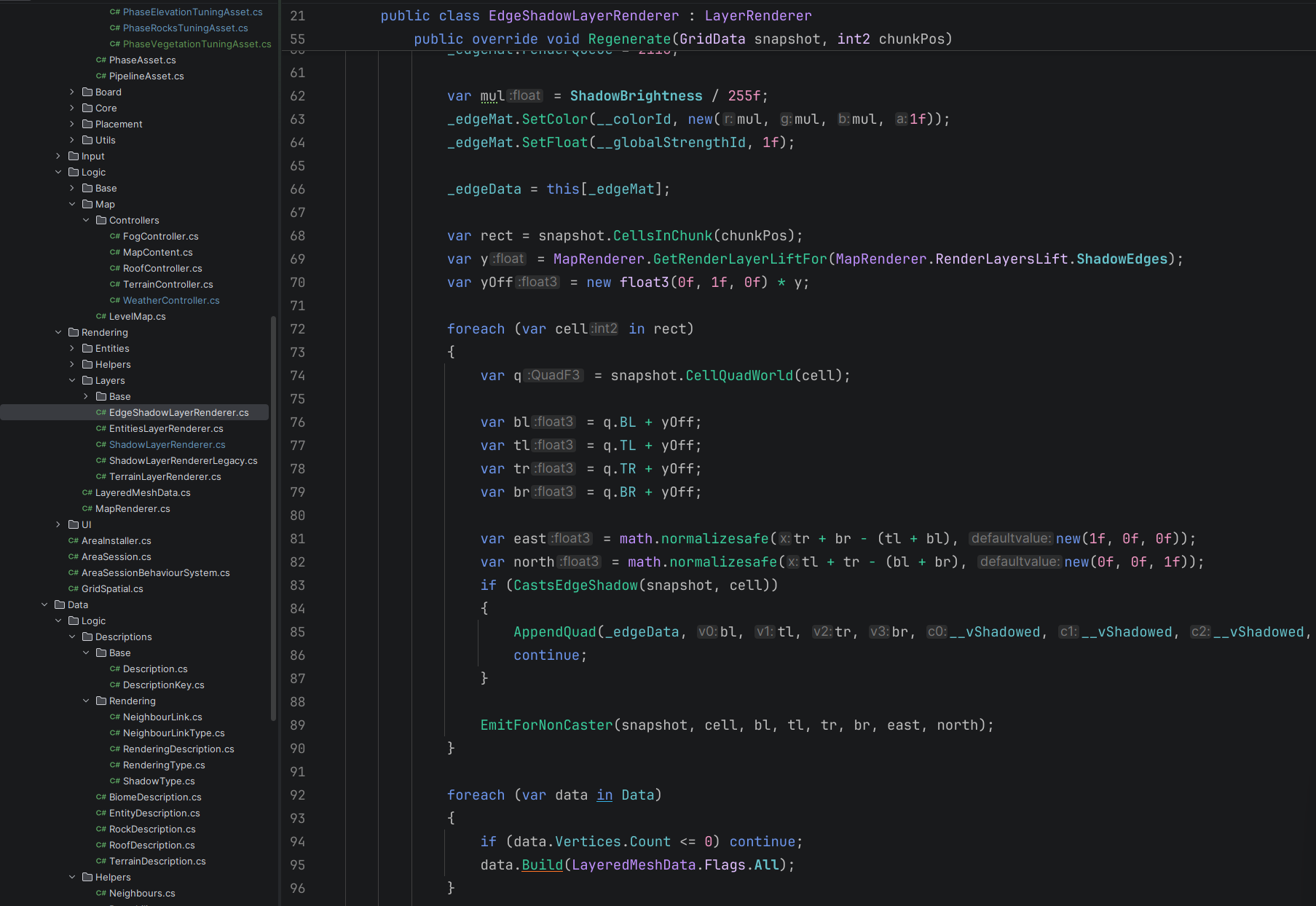 Один материал на все тени от гор/стен, меняю глобальное направление света, высоту подъёма солнца и его яркость и получается, что в рантайме тени движутся. Поебався со стыком теней на углах гор, в итоге получилось сделать даже лучше чем в Rimworld, у меня зазоров нет, так как я генерю дополнительные подложки, а Тайвин нет.