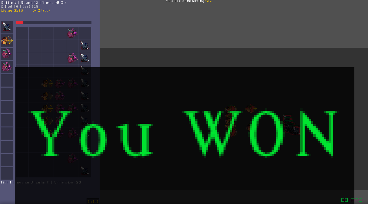 Вообще я поиграл ещё немного и, кажется, понял, что ты имеешь в виду. Когда я первый раз это запустил - я сразу посмотрел на статы и моментально построил оптимальную стратегию на минмаксе, с танками, саппортами и дамагерами. И, естественно, тут же победил ИИ, который не успел адаптироваться и влетел в death spiral. А вот если использовать не оптимальные стратегии, а пытаться забрутфорсить всё zero-IQ мувами, типа раша танками или раша дамагерами, то ИИ к этому адаптируется, и в death spiral влетает уже сам игрок. Насколько я понял из контекста конкурса, у тебя используется какой-то эволюционный алгоритм для адаптации поведения ИИ. Таким образом получается, что либо ты нагнул ИИ сразу же, либо просто оттягиваешь момент проигрыша. И это, действительно, не оптимальная штука. Это буквально "кривая обучения" задом наперёд - то, чего в играх следует максимально избегать. В таком случае предлагаю тебе добавить в свой эволюционный алгоритм функцию накопления ошибок. Чем дольше ты играешь, тем больше рандомного хаоса добавляется в эволюцию ИИ. Ещё можно эту функцию увеличивать на некоторое значение по каким-то специфическим событиям: например, когда игрок теряет свою башню, или когда ИИ доминирует на поле игрока. А, ещё можно попробовать всунуть эволюционный алгоритм не только в поведение ИИ на спавне, но и в алгоритм поведения юнитов. Тоже добавит хаоса.
