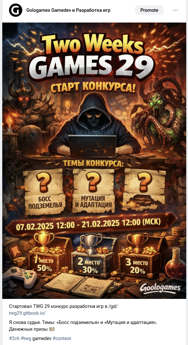 С 07.02.2025 12:00 по МСК до 21.02.2025 12:00 по МСК будет проведен конкурс Two Weeks Games 29! Это конкурс игр, где приветствуются все: от кодеров вечных велосипедных движков до любителей Ren'Py. Любые жанры и движки разрешены, главное — сделать игру по теме. Можно участвовать соло или в команде.