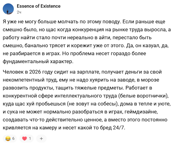 > Зачем терпеть манеру общения каких то маргинальных даунов, если можно её не терпеть и участвовать в десятках других джемов в тг и дискорде? Профит какой? Есть разные сообщества, с разными манерами общения, и особенно разной степенью иронии.