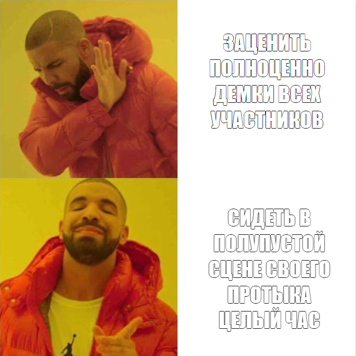На самом деле я не понимаю, что в голове у орга. Зачем ты всё это делаешь? Если ты пытаешься сделать конкурс лучше, как ты говоришь, то, ну я не знаю, может быть ты будешь делать то, что сделает его лучше, интереснее?
