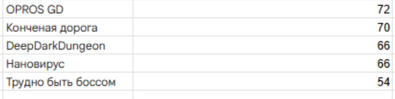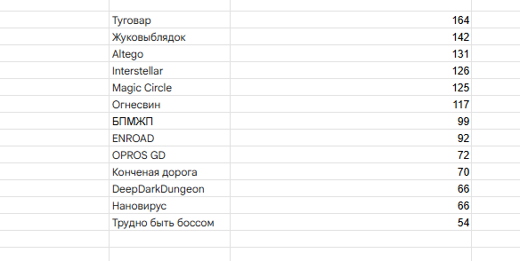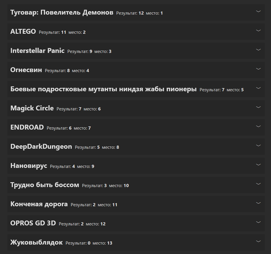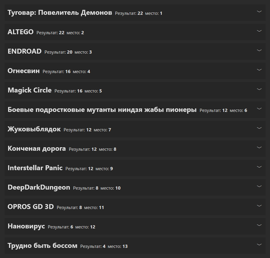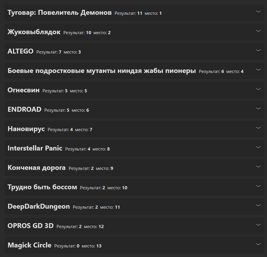 Результаты конкурса: Туговар: Повелитель Демонов — 164 - Первое место! Приз - 6000 руб и улучшенный пасскод. Жукопобедитель — 142 - Второе место. Приз - 3600 руб и улучшенный пасскод. ALTEGO — 131 - Третье место. Приз - 2400 руб и обычный пасскод. Interstellar Panic — 126 - Утешительный приз 1000 руб от ОПа и обычный пасскод. Magick Circle — 125 - Утешительный приз обычный пасскод. Огнесвин — 117 - Утешительный приз обычный пасскод. Боевые подростковые мутанты ниндзя жабы пионеры — 99 - Утешительный приз обычный пасскод. ENROAD — 92 - Утешительный приз обычный пасскод. OPROS GD 3D — 72 - У него уже есть пасскод. Конченая дорога — 70 - Утешительный приз обычный пасскод. Нановирус — 66 - Утешительный приз обычный пасскод. DeepDarkDungeon — 66 - Утешительный приз обычный пасскод. Трудно быть боссом — 54 - Утешительный приз обычный пасскод.