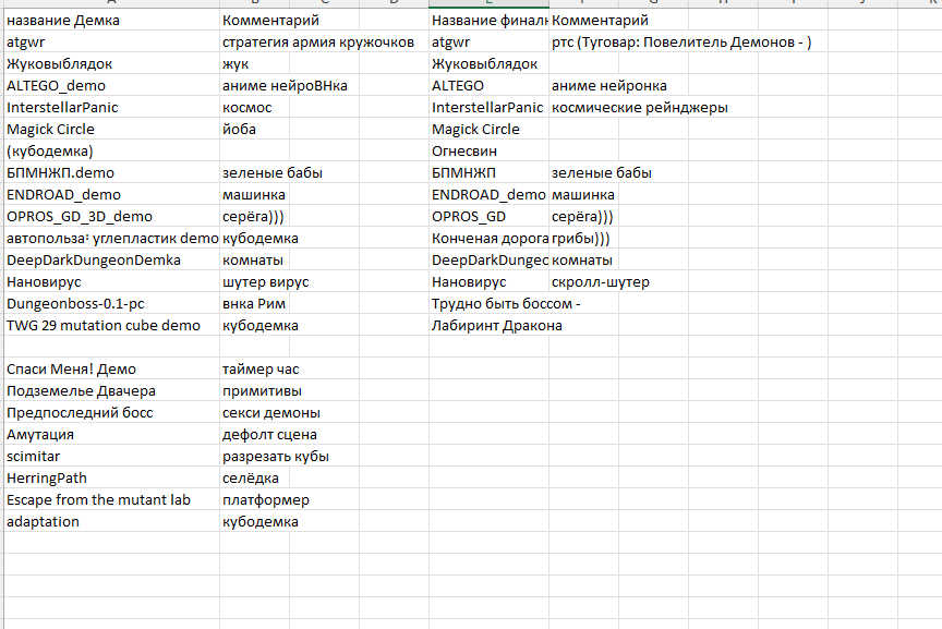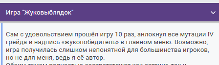Автор Interstellar Panic. Конечно я сильно разочарован объективностью, но это двач, хули я хотел.. Хотел написать всё таки про вторую оценку, за соответствие темы. Внезапно здесь оказалось впервые тема не просто формальность а якобы влияло. Но объективности это не добавило ни на грош. Возможно я виноват сам, стоило в ридми явно указать почему я считаю что и почему соответствует. Но и орг не прав, если ты явно включаешь это - стоило сразу писать явно, а не так. И то что желательно соответствовать ОБЕИМ темам сразу - в оценках все проигнорили. Распишу своё мнение про соответствие темам, первую оценку понравилась/не понравилась игра - не буду тут комментировать. Оценивать буду так - 0 - нет темы, 1 балл - только в сюжете, 2 балла - есть очень формально, 3 - участвует в геймплее. И, соответственно, две оценки, за каждую тему. Туговар Подземелья - вроде как заявлено в сюжете. Ни внешнего отображения, ни влияния на геймплей нет (также могло быть на небесах, в пустыне - без разницы) 1 балл Мутация и адаптация - ну, тут субъективно не требуется именно мутация, просто апай лучшего, но да ладно, 3 балла Итого - 4. Жуковыблядок Подземелья - не заявлено, 0 баллов Мутация и адаптация - именно мутации то и нет, ты просто выбираешь усиления. Но, наверно, это действительно сложно реализовать, 3 балла. Итого - 3. Альтэго Подземелья - не заявлено, 0 баллов Мутация и адаптация. Заявлено только в сюжете. На геймплей никак не влияет, это игра про девочку, где просто для соответствия темы просто добавлен пролог. Мутация внешки в процессе в альтушку... Ну.. Ладно, 2 балла. Я б 1.1 поставил, но ладно, пусть 2. Итого - 2 балла. Интестеллар Подземелья - большая часть сражений происходит в астероидах, которые я хотел представить как космические подземелья. Специфические тоннели, пещеры, условия боя. Считаю реализовал на 3 балла. Мутация и адаптация. Кораблик можно апгрейдить, можно вкачать по разному (в ракеты, пушки, лазер, скорость или хп, скорострельность или щиты) При этом именно мутация - то есть можно откатить. То что это вобщем то всё не требуется для прохождения и можно на одном лазере, закидав мясом - сознательное упрощение, понимал что не будут задротить и не все любят/умеют превозмогать в аркадах. Тут тоже 3. Ну можно 2, без разницы. Итого 6 (но максимум 5) Мэджик Циркл Подземелья. Вроде не заявлено. 0 баллов Мутация и адаптация. Ровно один обязательный апгрейд (прыжок), фактически просто он открывается не сразу и всё. 1 балл Итого - 1 балл Огнесвин Подземелья. в принципе, только на уровне сюжета. 1 балл Мутация и адаптация. Есть апгрейды, мутации нет... Ладно, пусть 3 балла Итого 4 балла Сорри, про остальные не буду писать, но, думаю, мысль понятна. В общем вот. Ещё про свою скажу - понятно что сама идея мутации как будто не может быть применена к неживым объектам и понимал что большая часть игр будет про живых, поэтому сознательно выбрал мех, для разнообразия. Но, видимо, мне не простили этого.
