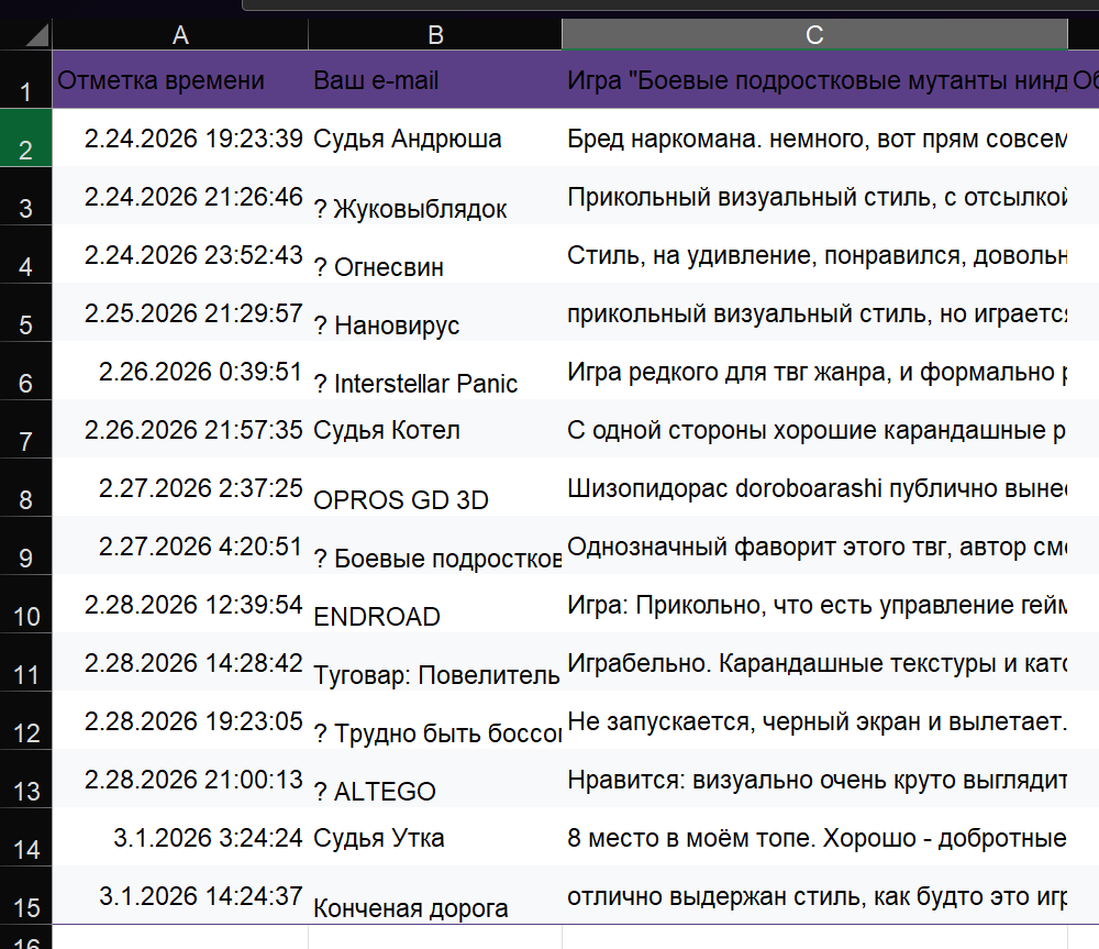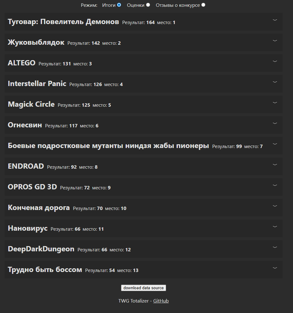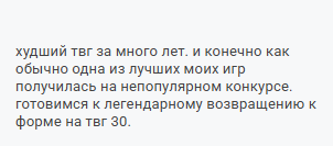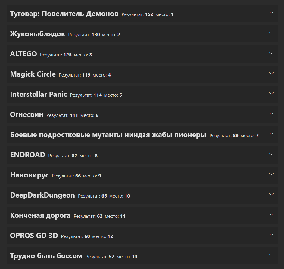 братан, твг 29 был не годным, а просто жалким агонизирующим подергиванием. пик был лет 5 назад, когда народ реально фигачил прототипы за неделю, судьи рубились в игры часами, а не по 5 минут скролля, и топы тянули по 300+ голосов. сейчас даже победитель еле 164 наскрёб, половина - утешалки с пасскодами за лояльность.