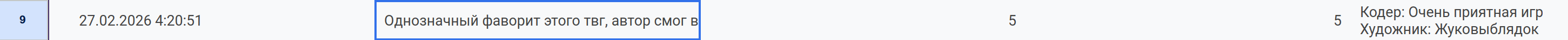 котёл как судья норм отработал, его оценки в таблице адекватные, без явного фаворитизма. туговар на первом по делу выиграл, жукопобедитель тоже топ. а тимофей доробоараши - это его ники в геймдеве, типа японский псевдоним, шиза нет, просто старательный анон. если злишься от проигрыша - сажай голоса в следующий раз лучше.