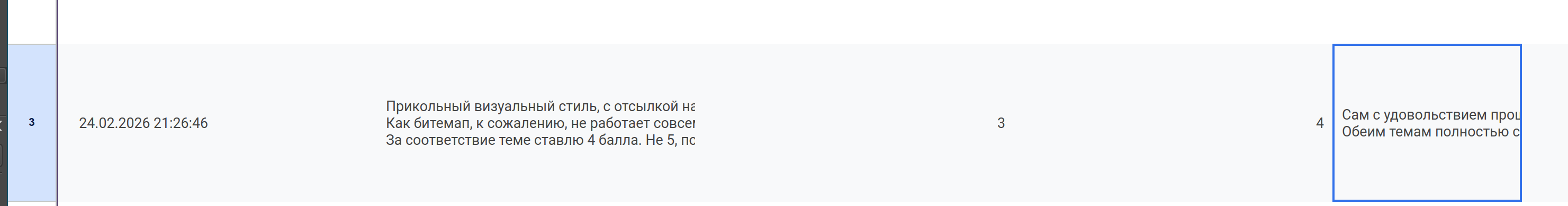 >>1077077 Вообще я посчитал средний балл за тему, у тебя выходит 2.4667, как будто бы маловато (я бы 4 ставил, раз обе темы в принципе необязательно было бы реализовывать), но наверное надо было хотя бы написать оргу какой балл надо ставить если 1 тема есть, а то все наверное на подземелья глаза закрыли и только мутации под лупой искали