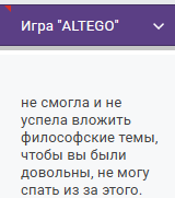 >>1077109 Ну ты же во внимание берешь, когда говоришь, что это невозможно придумать и сделать за полмесяца следующие нюансы: а) В целом смысл этой игрули был в том, что девочка хотела (о чем и написала), чтобы скуфы поиграли в игры её детства, а значит она заранее знала что и как должно получиться, буквально копировала уже готовую книжку, как ты и говоришь б) Чем проще мини-игра, тем меньше времени нужно, чтобы её полировать, игра, в которой всё, что от тебя требуется - ввести в текстбокс текст и нажать кнопку (точнее от тебя требуется ТОЛЬКО нажать на кнопку "далее") багов не будет содержать даже если бухим её написать в) Игру можно было сидеть и делать по 10ч каждый день на протяжении полмесяца
