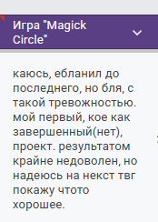 >>1076954 О, спасибо, что вы спросили. Я не сумел реализовать одну механику, поэтому дропнул конкурс, хотя дрочился больше дня с ней. Самое обидное, что я в голове разложил её логически, но с реализацией обосрался. Это морально придавило сильнее всего.