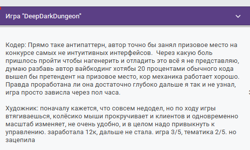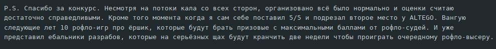 А про то, что это «не влияло на конкурс» — ну да, конечно. Когда пол треда пишут про то, какой орг мудак, это же и есть та самая атмосфера гд, ради которой мы все сюда пришли. Без срача конкурс — не конкурс.