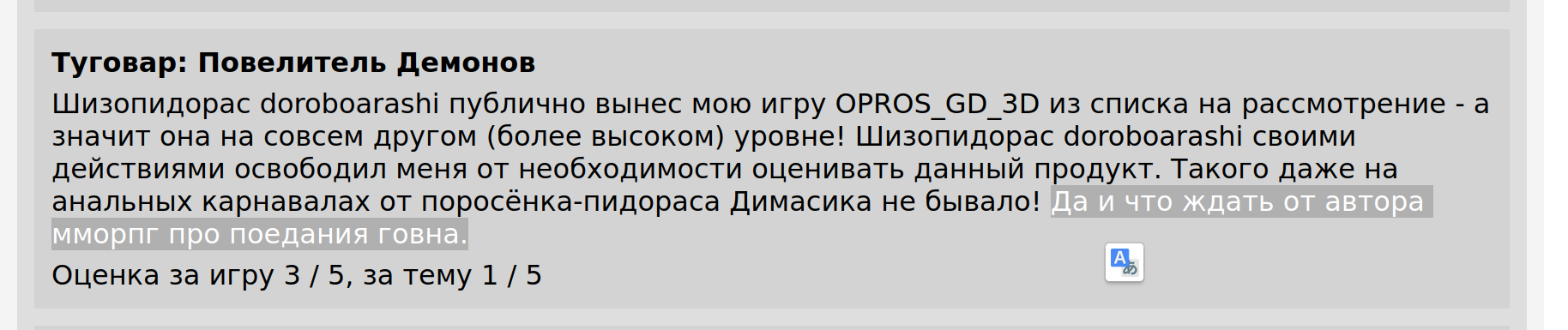 >>1077042 >какими-то ментальными кульбитами смог занизить оценку даже Туговару Где в Туговаре тема Подземелий, обоснуй? Что б в геймплее было. За вторую тему я ему максимум поставил, человек явно старался реализовывать эту тему. >Как думаешь, сколько людей стали бы в неё играть за рамками твг? Это применимо практически ко всем играм ТВГ. Не думаю что объективный показатель. Но ещё раз, я не оцениваю игру в посте, я оцениваю объективность второй оценки, как она описана оргом. К сожалению - большинство её использовали просто что бы удвоить свою оценку.