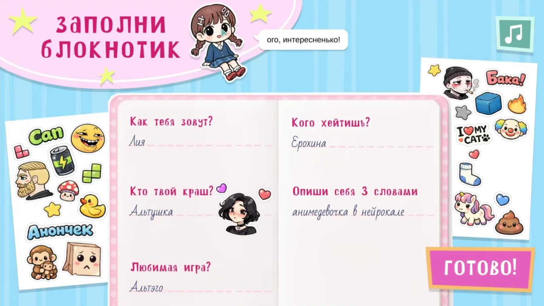>>1077044 Да не, это не заготовка, ты можешь любую из миниигр за ~5 промптов в клауди или ещё каком кале сделать за час, останется только рисунки сгенерить и вырезать