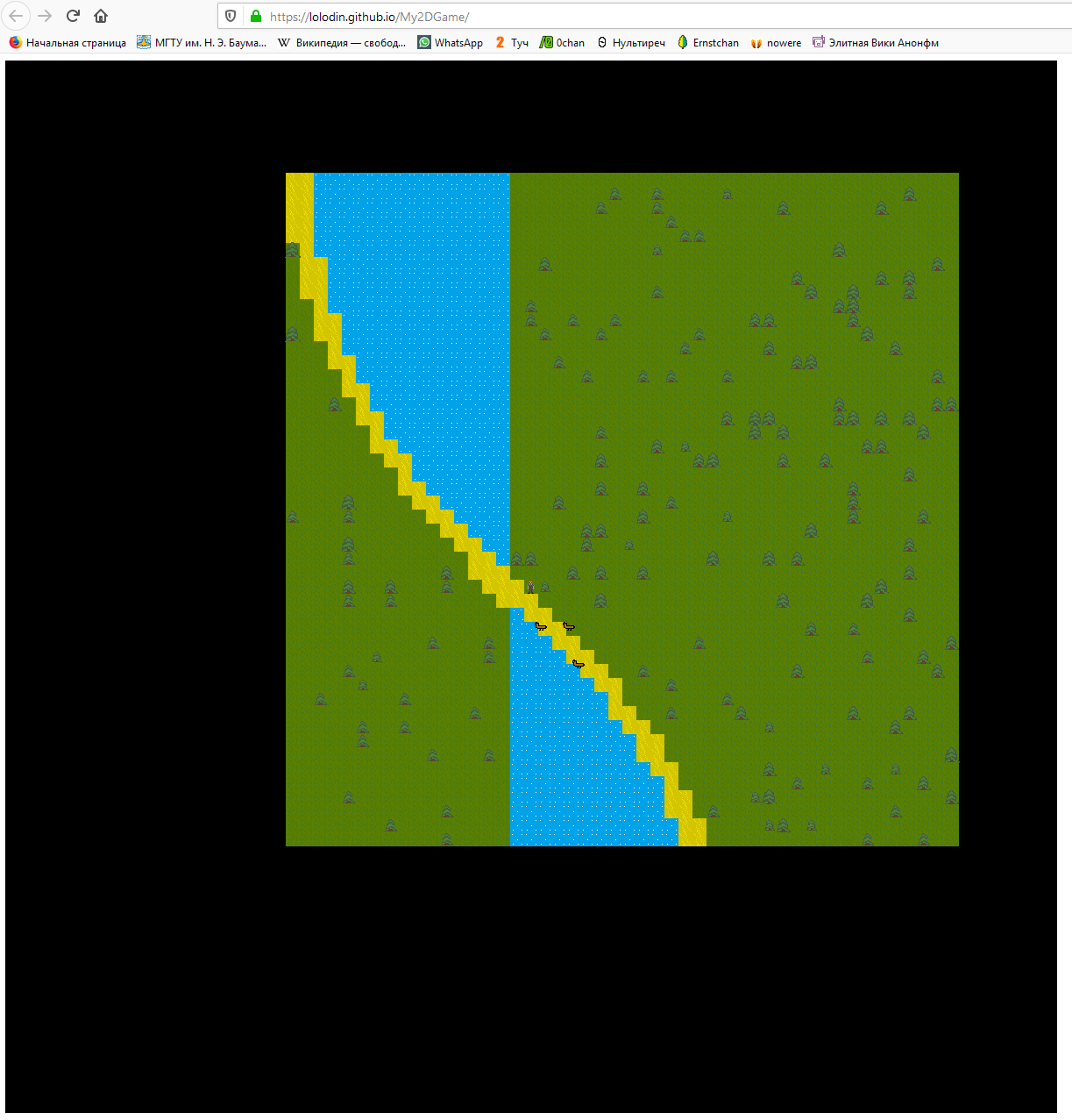 >Тем более планируется ли переход между уровнями? Как персонаж спустится на воду или заберётся на холмик? По ходу дела сымпровизирую. Или нет. Пока представляю как короткие прыжки. Надо сначала просто карту сделать, всё равно нет чёткой идеи игры, скорее попрактиковаться хочется)