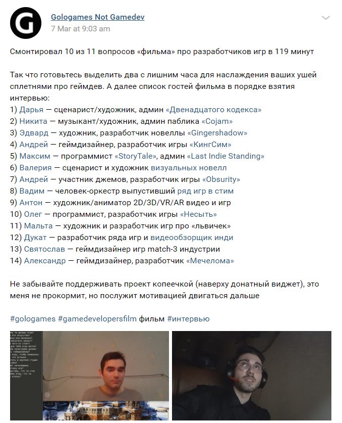 Посмотрел несколько минут. Потом фулл досмотрю, интересно послушать людей. Но интервью конечно говнарь похуже Дудя. Нахуя эти вопросы "почему ты этим занимаешься" и высеры по типу "игры же это недостойное занятие, лучше заняться наукой, а? А? А?!". По дефолта же понятно, что игры это не менее важная индустрия и увлечение, чем наука или срачи на дваче. Уж тем более ясно, что челики занимаются этим потому что им нравится и они кайфуют от всего этого дерьма. Короче говоря советую интервьюеру поработать над собой и дальше пробовать подобный формат или пойти нахуй. Как уж ему больше нравится