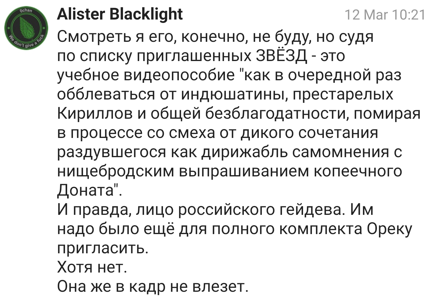 Ну что, Сабокевич, все срешь? Да, срешь. Люди просто занимаются чем по кайфу, как могут, как хотят. А ты срешь, Собакевич. Хотя если тебе тоже по кайфу, то сри, кто тебя остановит. Видео не смотрел. Но вот призрение Собакевичу серящему высказываю. Уже лет 5 прошло, а он в ГД все серит.