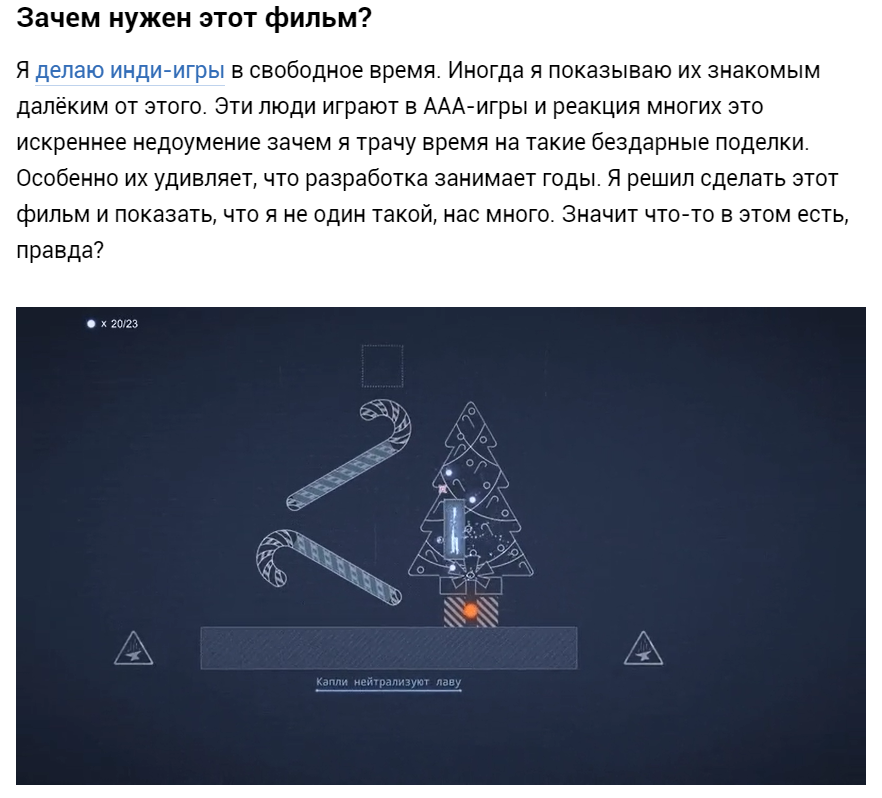 Смотрите и узнаете ответы на такие вопросы как ― Почему люди делают игры? Как закончить проект? Игры это искусство? А стоит ли чего-то идея?