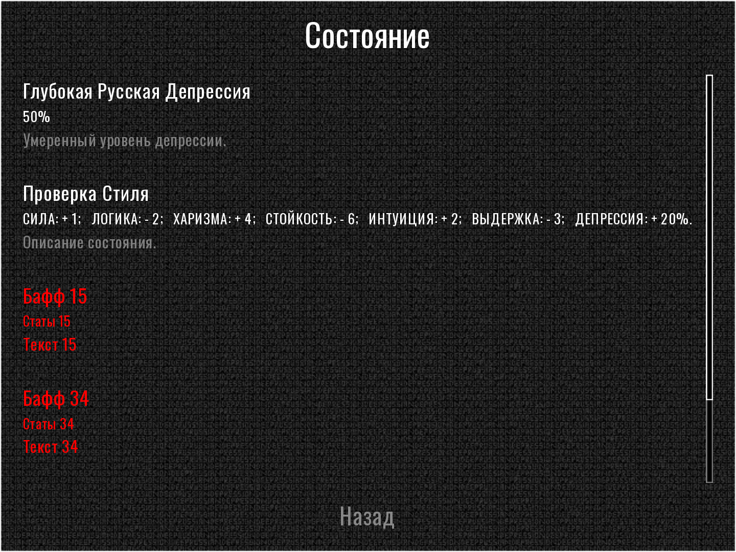 Исход событий будет давать бафф/дебафф на характеристики персонажа. Игрок победит, если сможет прочесть историю до конца и не сгинуть в реалиях русского мира.