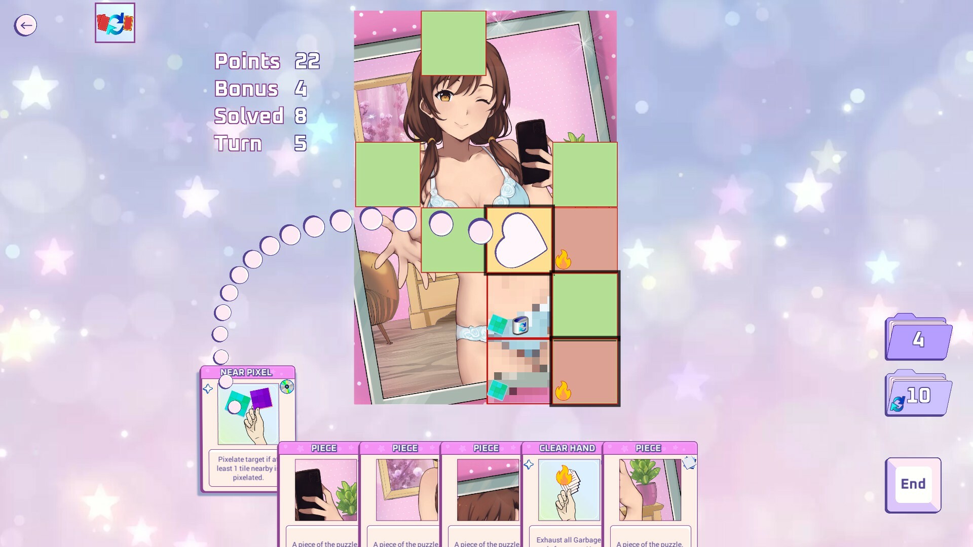 Бамп чтобы тред не потонул. Планирую через недельку выпустить демку Only Cards и опубликовать на f95. Потом будет отполированная демка уже на Некст Фест. Сделал около 40 скилл-карт и хз как ими будут пользоваться реальные игроки. Будет грустно если какие-то карты окажутся бесполезными, а имбовые комбинации слишком упростят сбор мозаики. Самому тестировать сложно, приходится подгружать случайные аниме-картинки с данбору и стараться смотреть на них как можно меньше. Если посмотрел и запомнил картинку, то все любой уровень без напряжения за 2-3 минуты решаю. Если почти не смотрел или плохо запомнил то 6-9 минут и с ошибками.