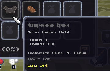 Добавил испорченную экипировку, будет иногда с бочек падать. В отличие от обычного серого хлама, это можно носить. Характеристики похуже нормальных аналогов. Не продается на кнопку "продать хлам", но это думаю потом в настройки добавить, чтобы не только хлам, но и определенный шмот продавало этой кнопкой. Если потом добавлю взлом замков, то закрытые сундлуки можно будет взламывать силой, с шансом превратить ценный лут в такую сраку.
