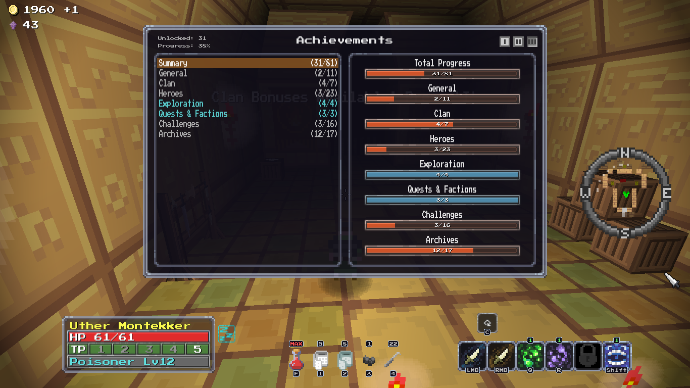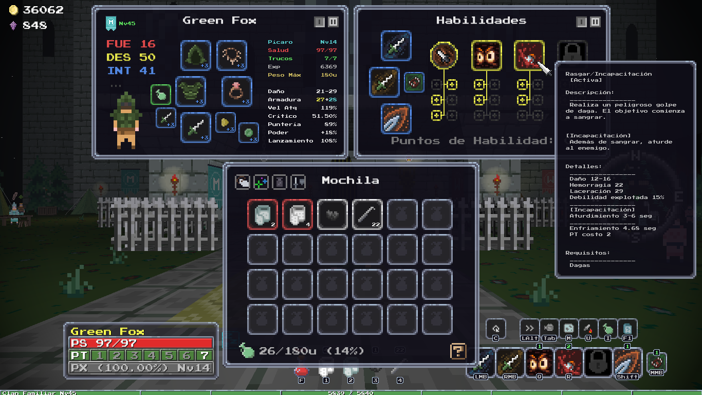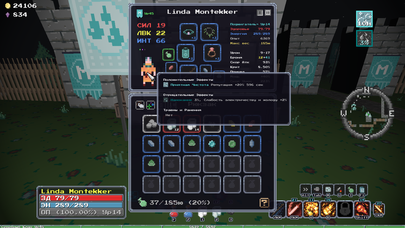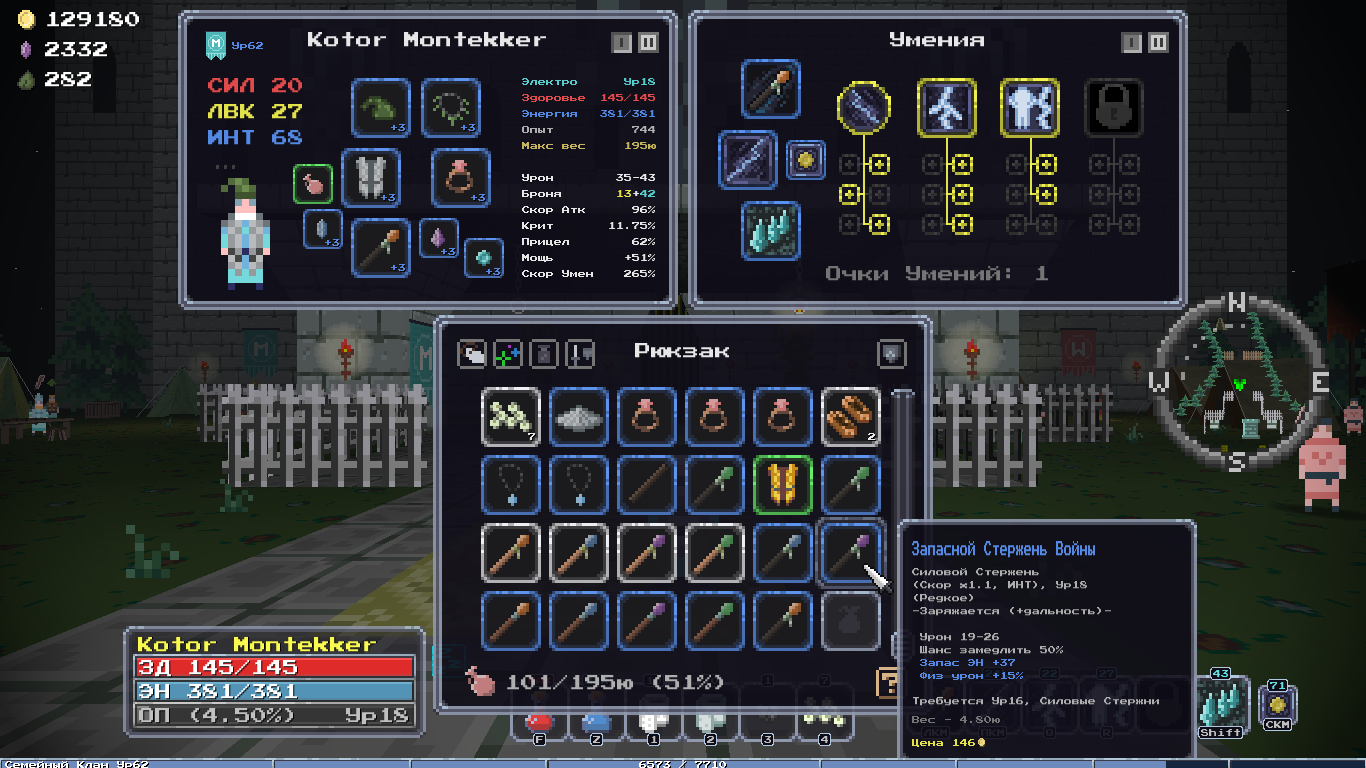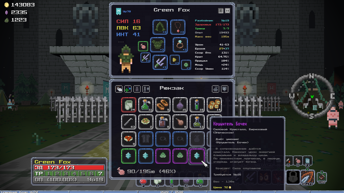 Добавил новый квест, после которого появляется новый алкаш торгаш в клановом имении, у него можно купить новую сумочку зеленого качества и цвета, пусть гоблоиды завидуют твоему стилю! А ещё добавил новую врожденную особенность, "Везунчик", 10% шанс двойного дропа с сундуков, шанс выжить самому +10%, редкая особенность.