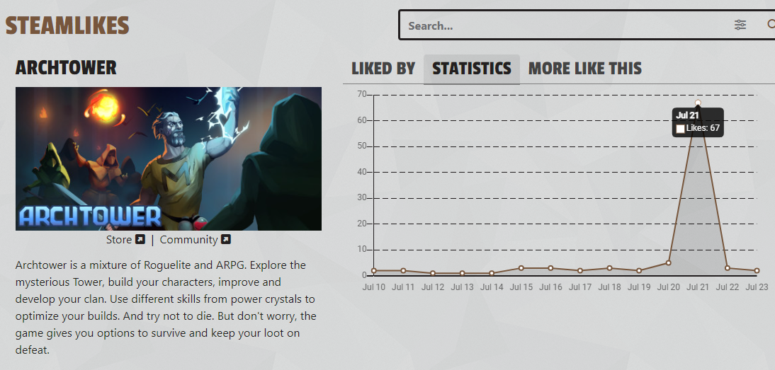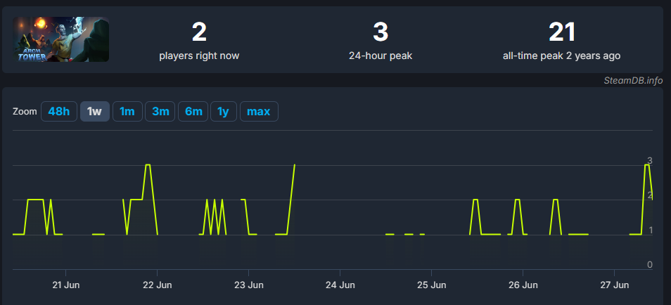 >>889128 Через пару дней был аномальный скачок показов в похожих играх у других проектов, но не уверен что это связано. Алгоритмы успокоятся только когда будет нормальный процент конверсии вишей (сейчас 7.1%, а надо где-то под 19%), а это уже на полном релизе, ибо алгоритму похуй что ты в раннем доступе. А до тех пор покупки будут капать с рандомных вишей и во время распродаж. Может ещё скачок будет когда будет продаж на 10к бачей, там предположительно снимут статус недоигры, разрешат больше 100 ачивок и дадут карточки.