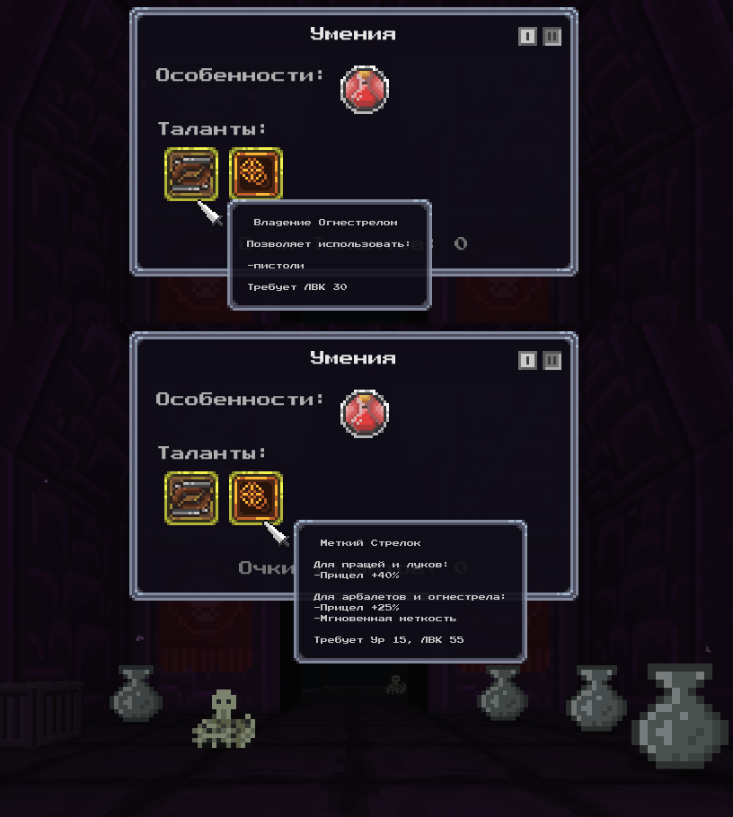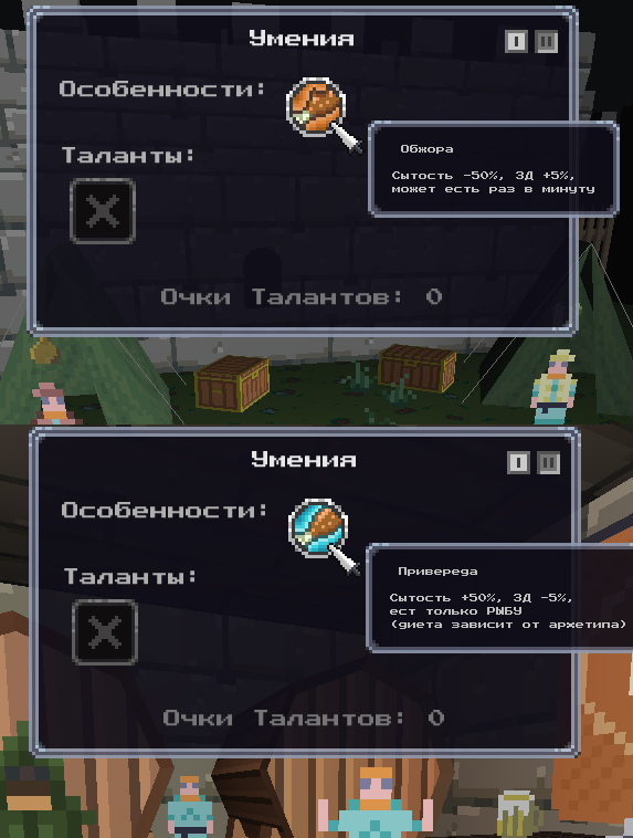 Так же добавил две новые врожденные способности: "Обжора" - длительность сытости -50%, макс здоровье +5%, может повторно жрать, когда от бафа прошла всего одна минута "Привереда" - сытость +50%, макс здоровье -5%, может есть только один вид еды (зависит от архетипа)