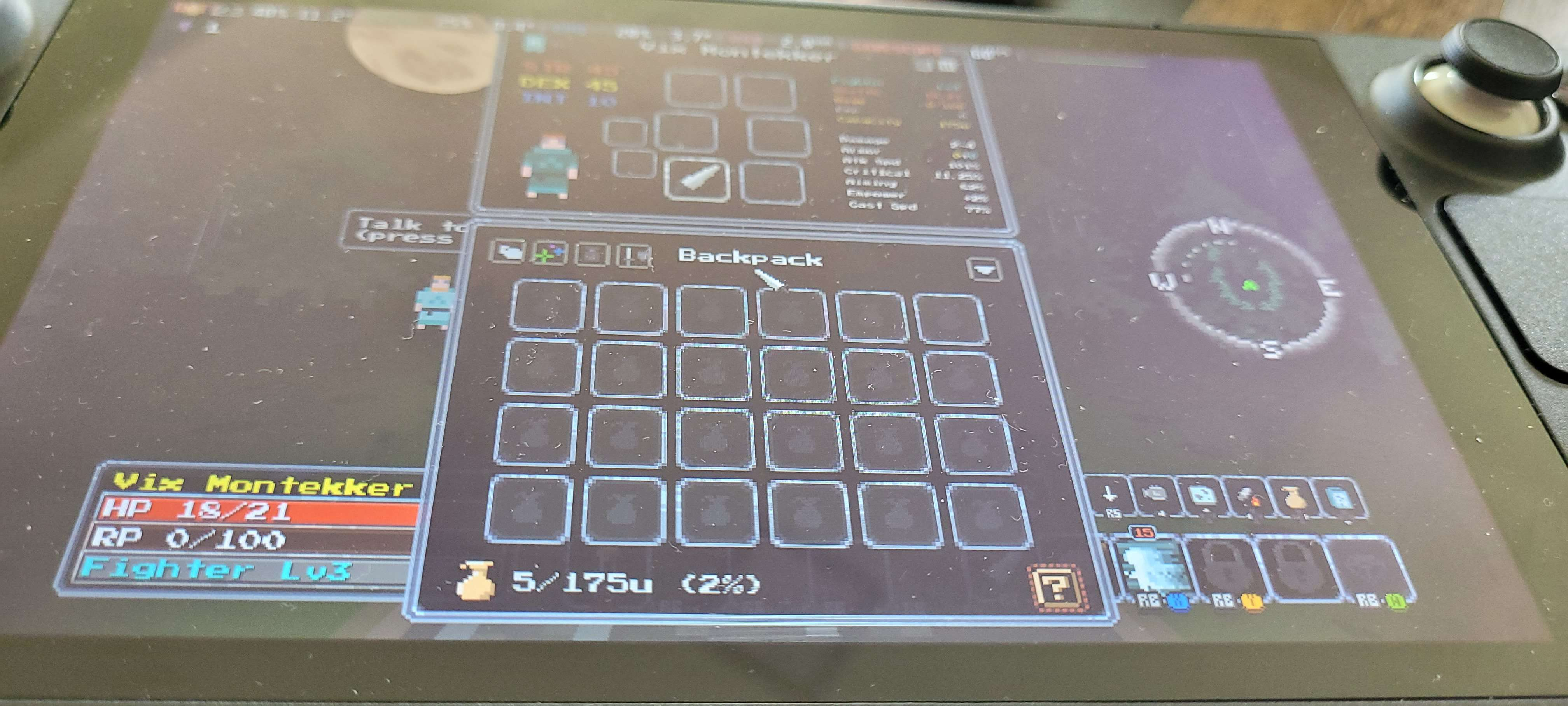>>965115 >>965117 От твоей карты местности у меня мозг болит. Глаза режет и ее обрамление, и то что нарисовано внутри. Наверное главный проеб именно обрамление. Все остальные элементы интерфейса мелкие и аккуратные, а тут пиксели размером с кулак. Я бы сказал выкинуть ее нафик. И пуская карта внутри будет чуть больше и с полупрозрачными исчезающими краями. То есть мы уже видим прозрачный пол на карте, так что это просто дополнит интерфейс.