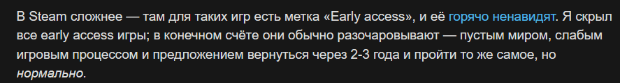 -если игра приносит деньги, с ранним доступом можно заниматься фултайм разработкой и не искать левую работу/подработки -ненависть к раннему доступу не настолько сильна, чтобы его вообще все избегали -если игру не купят из-за раннего доступа, это не значит что её не добавят в вишлист -ранний доступ не для всех жанров подходит, а для некоторых игр это даже вполне приемлемо считается -без раннего доступа некоторые игры никогда не вышли бы в свет