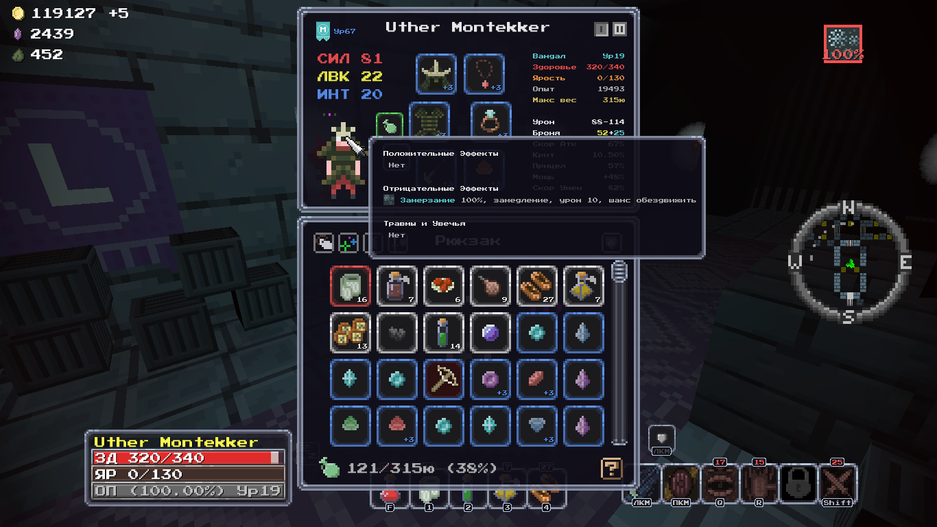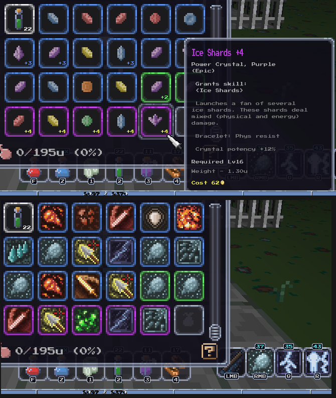 Так же сделал первый предмет эпического качества, пока эпики только кристаллы, остальную экипировку эпического качества позже подтяну. И ещё сделал новый эффект "Замерзание". В прохладных локациях копится от морозного урона, а в холодных потом будет и сам по себе копиться. Замерзание постепенно снижает скорость бега, на 75% начинается ежесекундный небольшой урон (% от макс хп), на 95% урон удваивается и при уроне есть шанс примерзнуть на пару секунд, на 100% урон ещё больше усиливается.