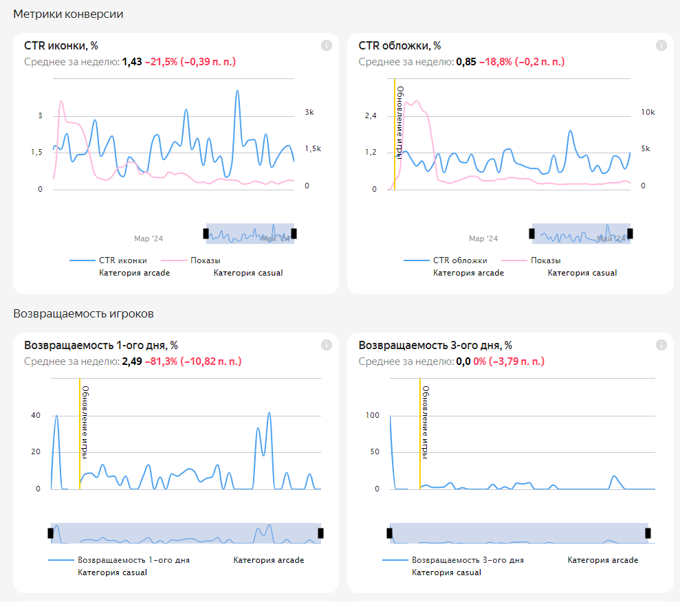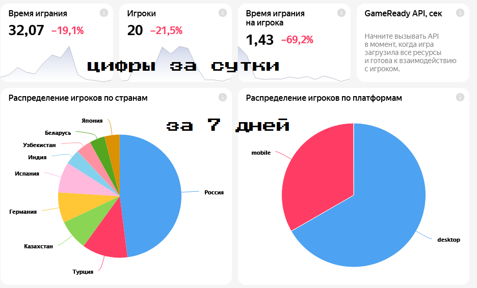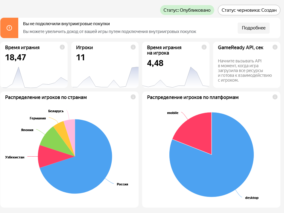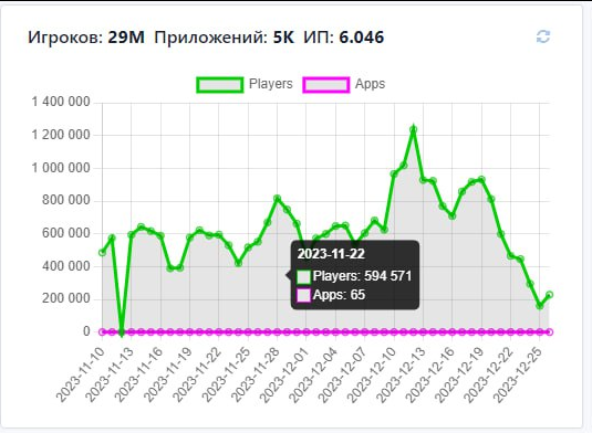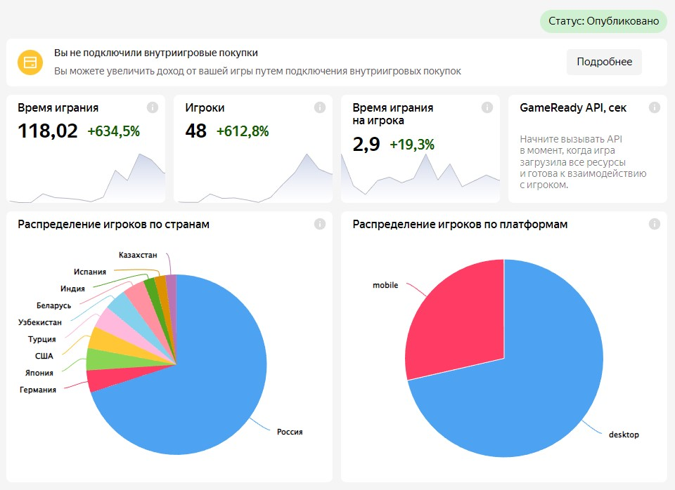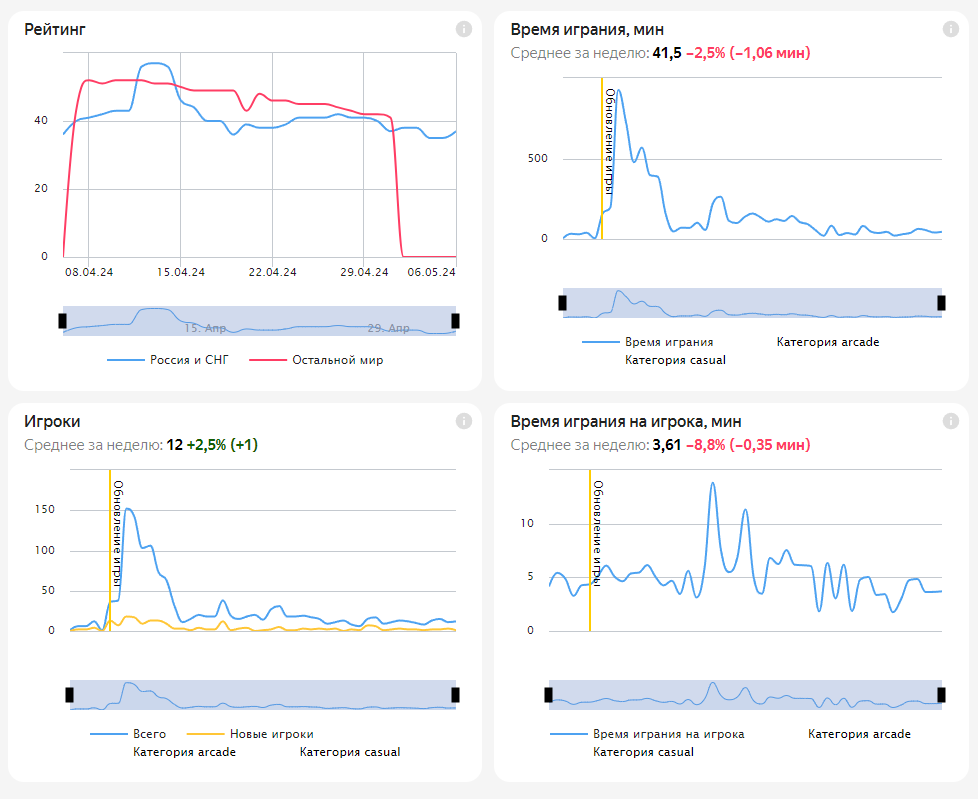 По метрикам ещё рано смотреть т.к. прошло всего 5 дней с релиза, но вижу что потихоньку количество игроков в день растет т.к игра наконец-то отображается в новом (первые пару дней её там не было). Сейчас 36 игроков в день