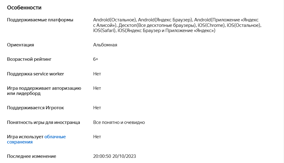 > Игра или WebApp корректно запускаются в браузерах и на платформах, которые подходят под выбранное в черновике окружение. Список браузеров и платформ: > В браузерах: Яндекс Браузер, Google Chrome, Mozilla Firefox, Opera, Safari, мобильном приложении Яндекс.