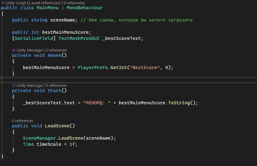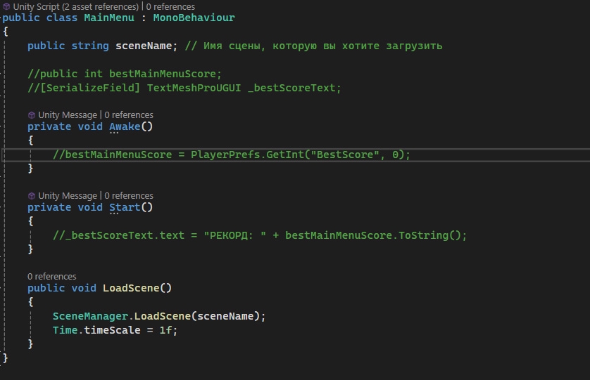 P.S. На одном из скриншотов код незакомментированный - и он не работает. На втором код закомментирован - и все работает, из главного меню я (нажав на кнопку "Играть") попадаю в сцену с игровым процессом.