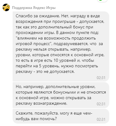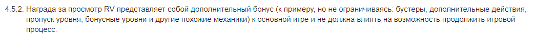 Че за хуйня, в чем логика блять, получается нельзя давать дополнительную жизнь за просмотр если игрок проебал? Ну ахуеть можно. Или я все же не правильно понял и имелось в виду что то типо "если ты не посмотришь рекламу то на следующий уровень не пройдешь"? А вообще дополнительная жизнь по факту подходит под понятие "бонусный уровень". Сука, я нихуя не понимаю. Если все же на самом деле все так как изначально подумал, то сделаю что бы перед стартом вылазило окно с предложением посмотреть рекламу и получить доп жизнь, хуй тут доебутся уже, по факту это своего рода "бустер" будет.