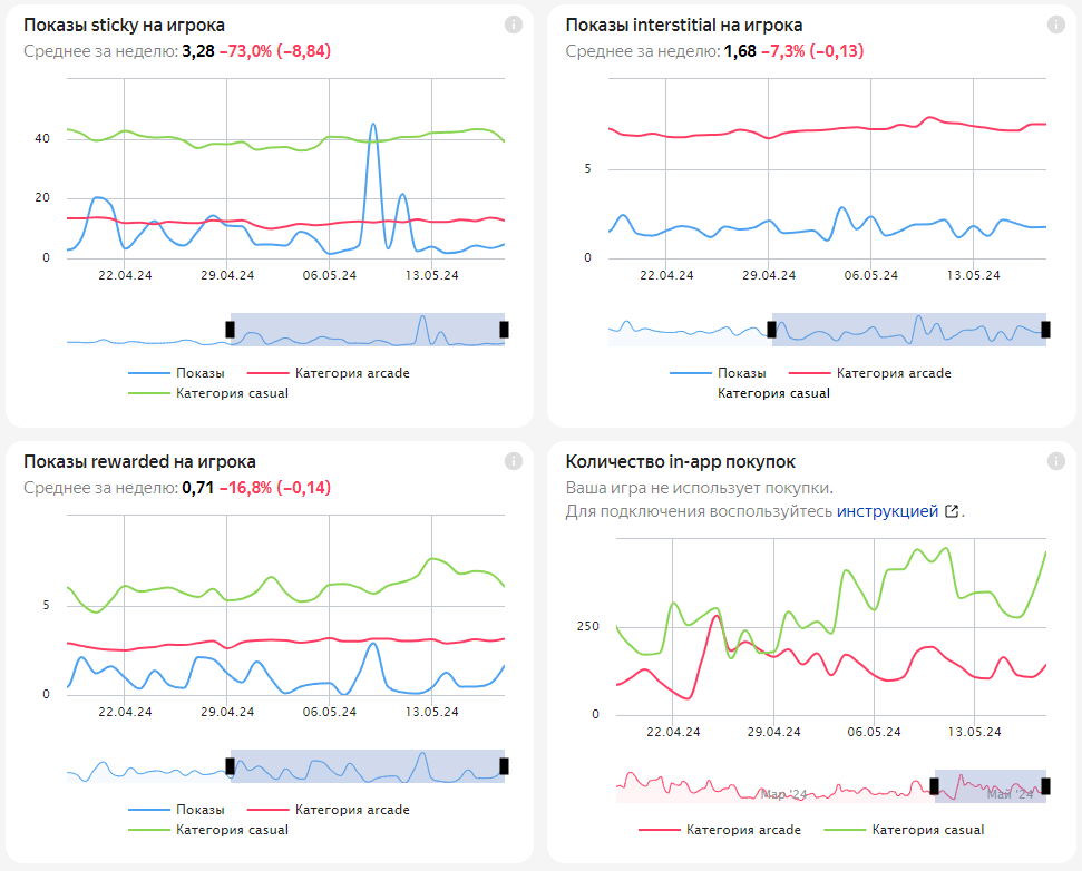 🟢 Зеленые игры — те, у которых метрики лучше средних. Они набирают аудиторию и часто становятся большими хитами. Как правило, разработчики регулярно их улучшают: добавляют новый контент, работают над мотивацией и возвращаемостью пользователей.