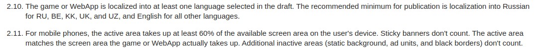 Блин, где-то была таблица со всеми сводными требованиями в игре на яндекс, теперь не могу её найти здесь https://yandex.com/dev/games/doc/en/ У кого-нибудь осталась? Там что-то говорилось про максимальный размер игры в 100кб при добавлении игры простым способом и более 100кб при добавлении архивом.