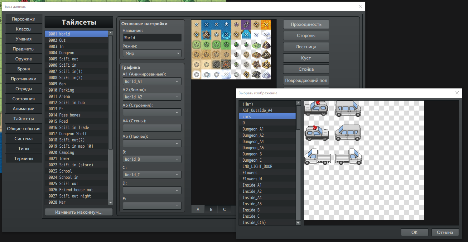 >>923895 В базе данных в разделе тайлсетов можно настраивать колизии с тайлами. Кружочек - можно пройти по тайлу, крестик - нельзя, звездочка - тайл накладывается сверху на персонажей.