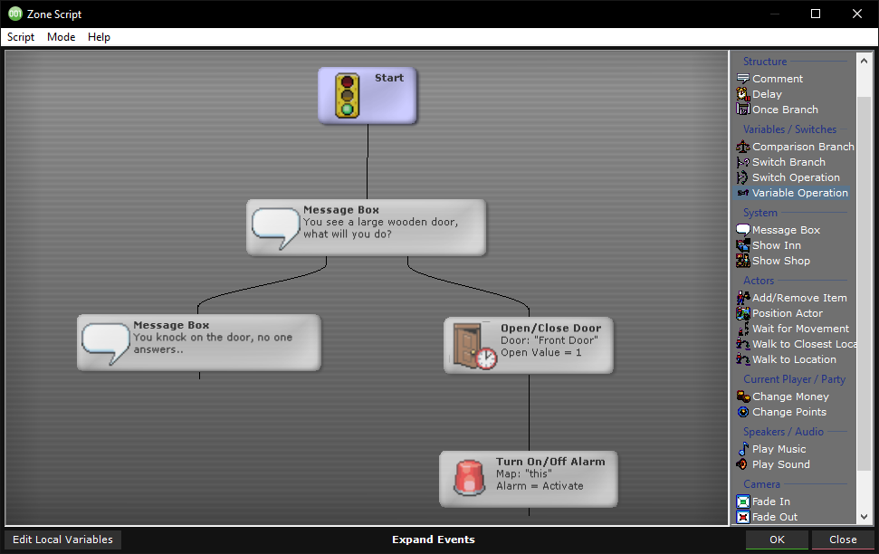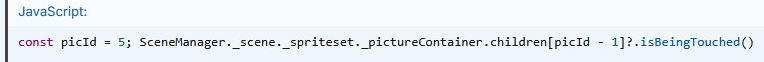 А не подскажите, нет ли какой базы скриптов по MZ с пояснениями какой параметр что делает. Мне конкретно ивенты нужны. Например скрипты Erase, ShowPicture, MovePicture Чтоб писать примерно такую фигню, а не кнопочки жать, которые не всегда удобны: Loop Script: $gameScreen.movePicture(5, 0, 816, 624, -100, -100.5, 255, 0, 120); Wait 120 Frames Script: $gameScreen.movePicture(5, 0, 816, 624, -100, -100, 255, 0, 90); Wait 90 Frames Repeat Above Можнодогадаться, но мне лень расшифровывать экспериментами. Может как-то можно открыть проект в блокнете и там эти кнопочные эвенты скриптом записаны видно будет?