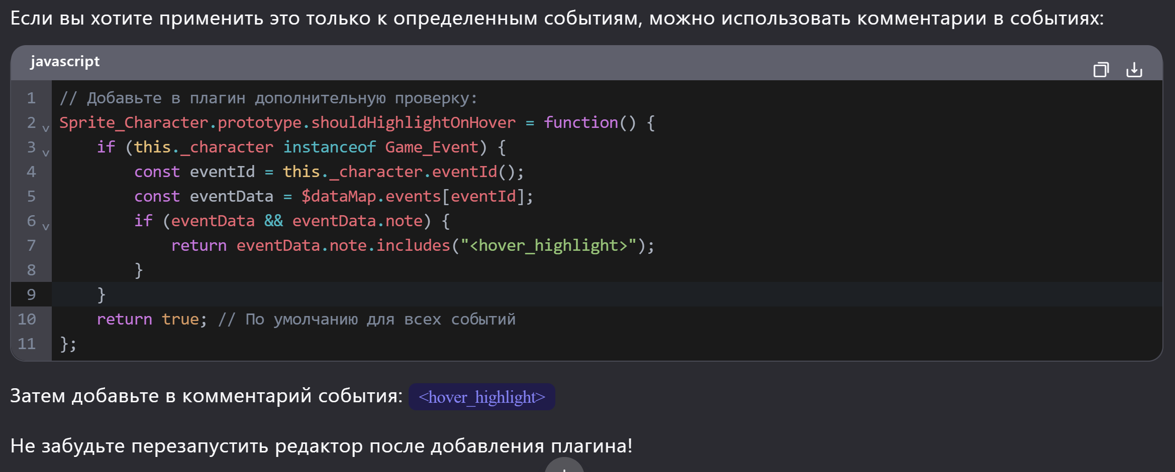В RPG Maker MZ можно реализовать изменение цвета события при наведении мыши, но это требует немного JavaScript-кода, так как стандартный редактор не предоставляет такой функциональности "из коробки".