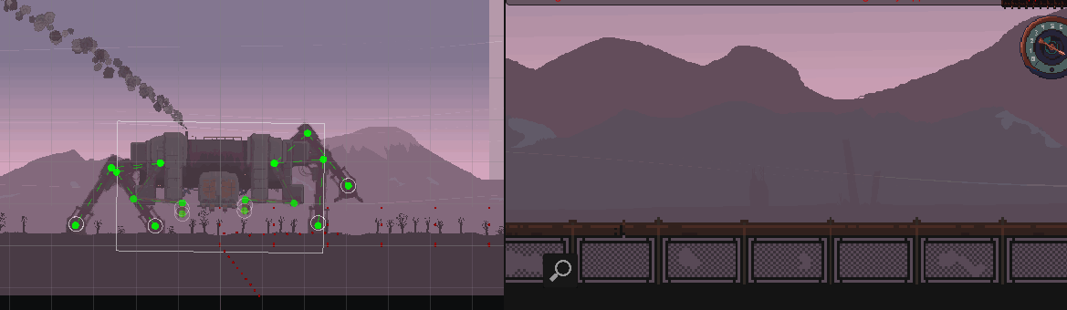 Я просмотрел несколько архивных версий проекта и заметил, что с каждым новым билдом графика ландшафта становится все примитивнее. Дело в том, что каждый раз я выпиливал какие-то фичи связанные с ней в угоду производительности. В начале ландшафт был покрыт этим стилёвым розовым градиентом, который при этом на всех слоях был разный. Потом градиент остался один для всего ландшафта. Теперь же все вообще стало плоским. Причина тут в том, что смартфон это вам не пека, и графические возможности там соответственные. Даже просто рендерить один полупрозрачный спрайт 2048*2048 это для него уже серьезная задача. К такому я был не очень готов. Вероятно должны быть какие-то обходные решения, как сделать красиво и чтобы андроид не захлебывался, так как в оптимизацию я пока особо серьезно не упарывался. Надо над этим поработать, а то так весь антураж теряется.