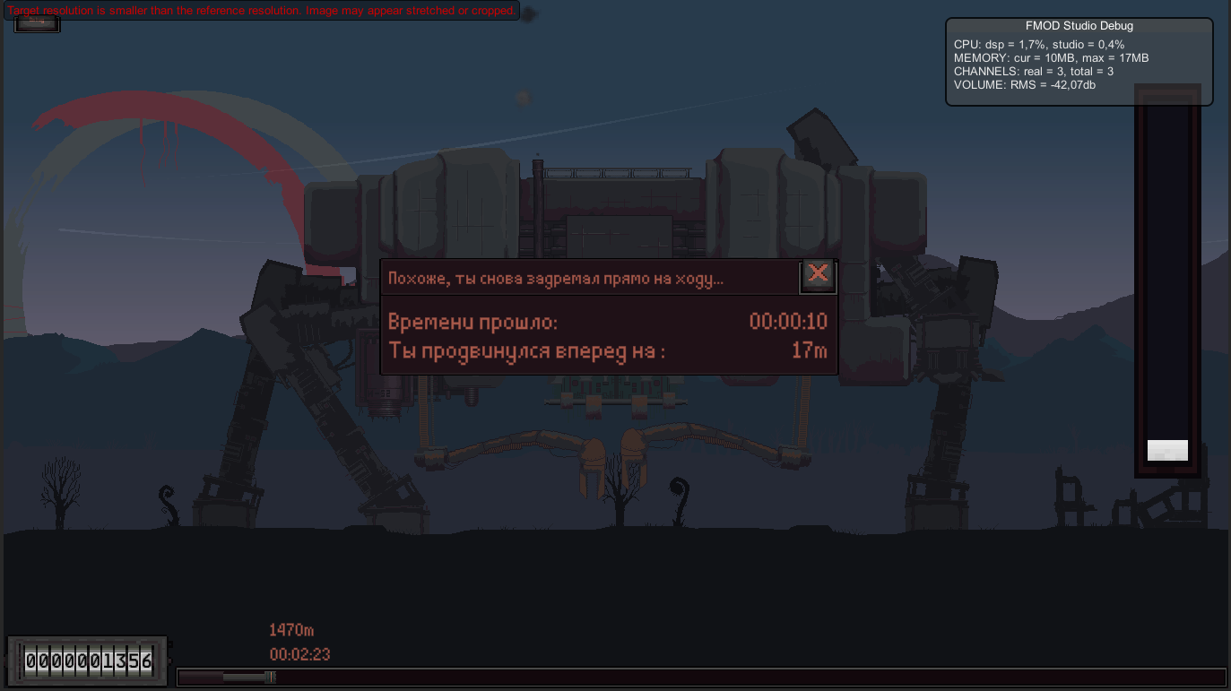 Поиграл в FAR: Lone Sails. Я даже купил его в стиме по скидке . Мое почтение конечно, красивая вещь. В очень многих аспектах похоже на то, что я хочу сделать, по крайне мере в плане визуала и атмосферы, правда 3д графику я точно не потяну, хоть она и крутая. Я очень удивился когда доехал там до радиовышки, так как тоже хотел сделать некий гиммик, связанный с радио и в своей игре. Правда тут я планировал его как штуку, которую можно в какой-то момент найти и далее постоянно возить с собой, периодически прослушивая эфир и время от времени ловя некие сигналы. Я думаю, радио и пустынные заброшенные миры это хорошее сочетание.