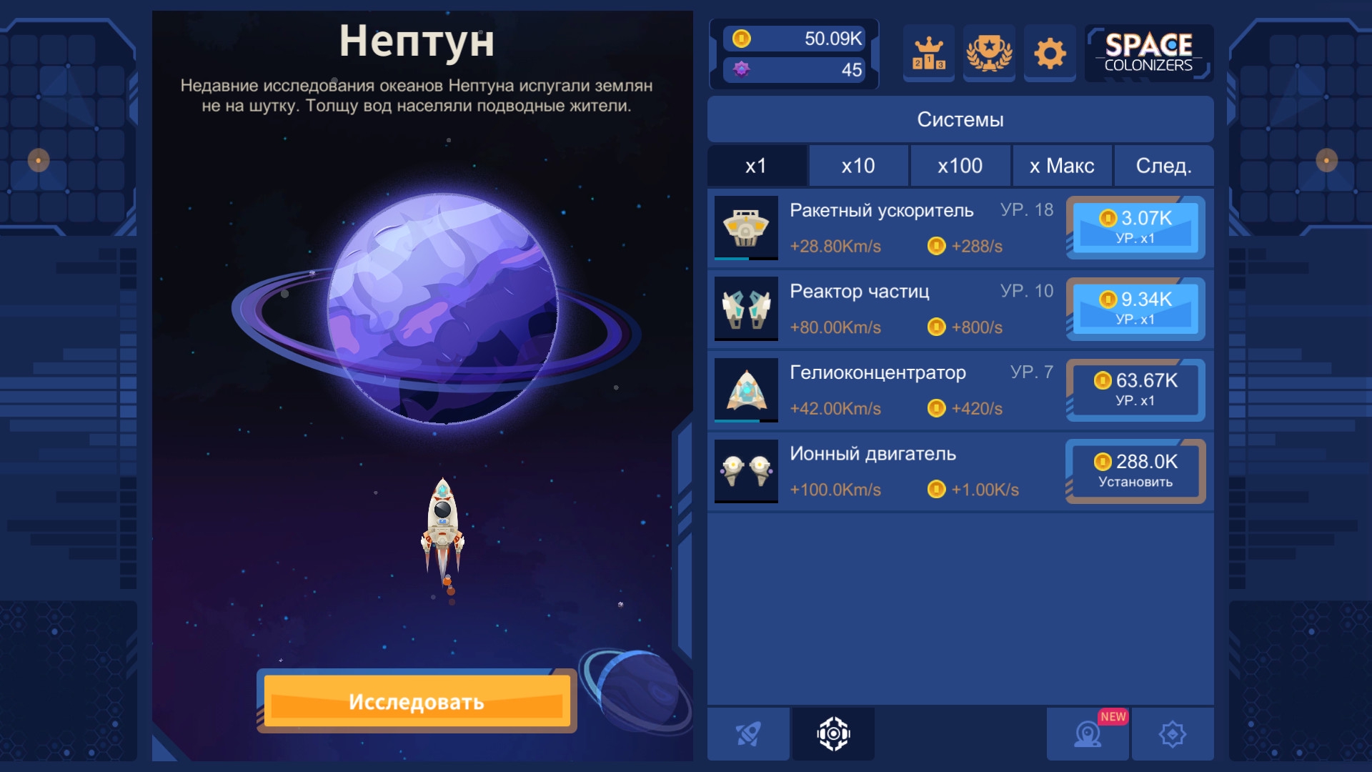 У одной миллион скачиваний, у другой 500к. Перед тем как начать разработку я поиграл в обе. И в той и другой основная формула довольно близка к тому, что у меня: мы пассивно двигаемся вперед, параллельно делаем очень незамысловатые действия и качаемся. Первая игра это какое-то вырвиглазное донатно-рекламное безумие, будем честны, а вот вторая мне искренне зашла и я наиграл в нее прилично. Это игра про то, что мы летим на ракете, собственно от одного вейпоинта до другого, а весь геймплей между ними заключается в том, что можно тыкать астероиды, выбивая из них голду, качаться за нее и еще иногда жмякать на черную дыру, которая тебя дополнительно ускоряет. Ну и да, выходишь из игры а ракета сама летит. В этом геймплее просто 0 челенджа, тем не менее мне все равно было интересно. Причем, лично для меня, основной интерес представлял именно некий дух исследования и желание посмотреть что будет на следующем вейпоинте. спойлер: пнг с изображением планеты и подпись из двух строчек.