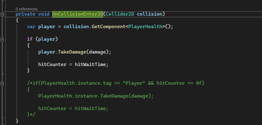 >>934461 >Мда, ну значит пиши collision.gameobject.GetComponent<PlayerHealth>(), сложно догадаться чтоль. Из-за этого первоначально код неправильно написал. Сейчас исправил - все заработало, без слоев и их отключения. Спасибо.