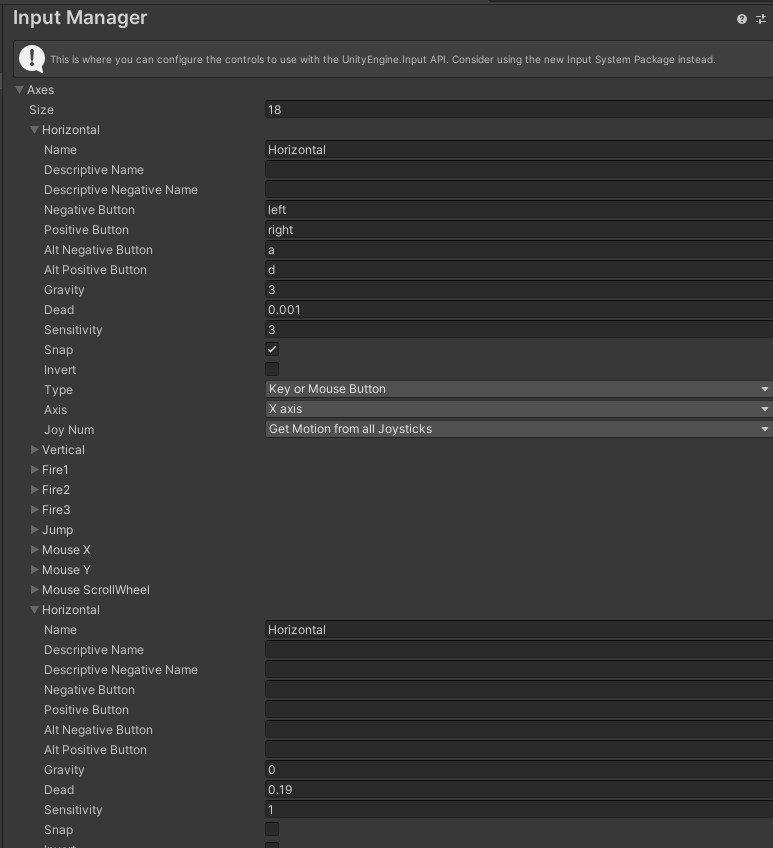 Объясните нубу, что я делаю не так. Начал проходить курс на ютубе. Повторяю все за автором, хоть он и многие моменты не объясняет, но я сам разобрался. Что я имею. Игра запускается, код ощибки мне не выдает, но персонаж не двигается. Уже в юнити ошибку выдает ArgumentException: Input Axis horizontal is not setup. Гуглил, пытался настроить, но перс не двигается. В геймдеве новичок, как и в программировании.