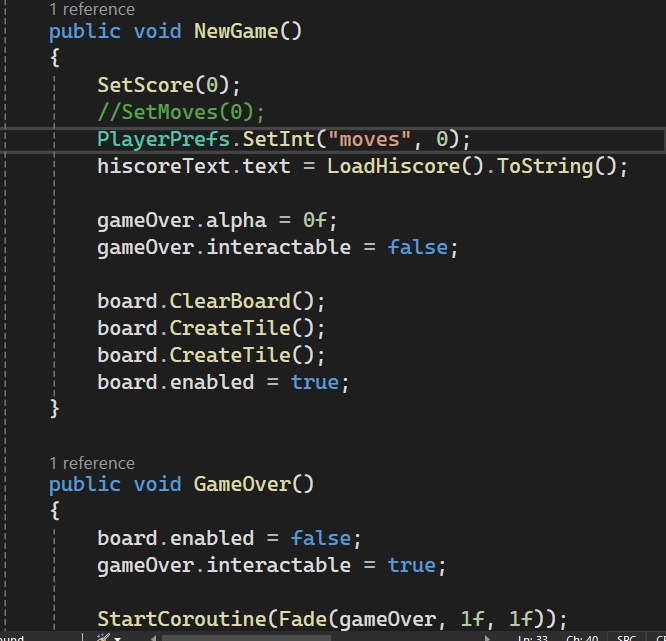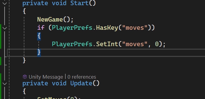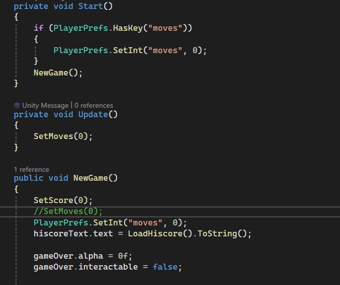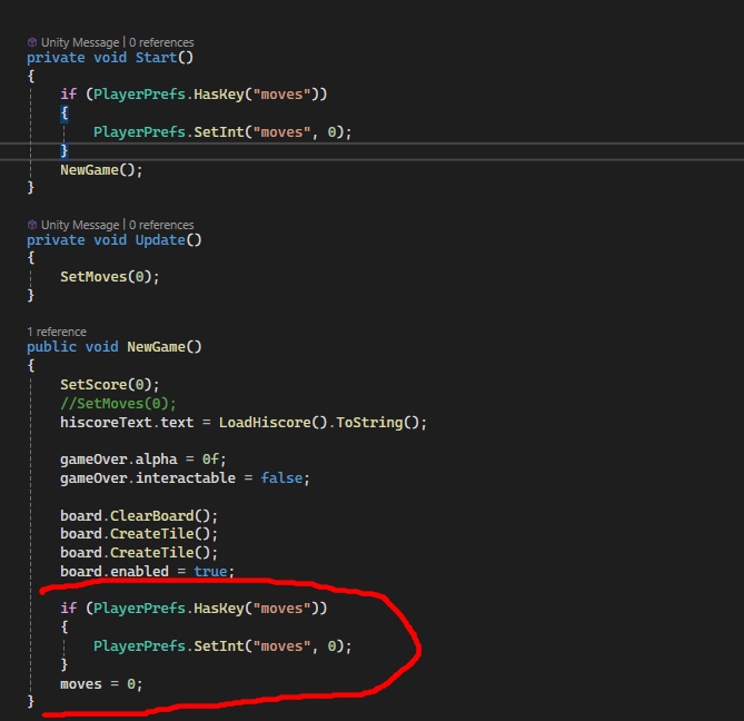 >>942593 Вот смотри: сейчас в классе TileBoard я создал переменную movesCount. Инкременирую ее в этом классе - и она увеличивается. Потом из класса GameManager через синлтон запрашиваю ее: moves = TileBoard.instance.movesCount. Казалось бы, почему она в этот-то раз не грузится? В чем здесь логическая ошибка, и как переписывания кода поможет мне это понять?
