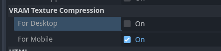 >>942244 Я понял в чем оказался подвох. При экспорте я ставил обе галочки. Это и привело к тому, что размер удвоился, каждая текстура оказалась добавлена в 2х вариантах. Это же, повлияло и на яркость. А точнее, текстуры в режиме For Mobile в большинстве черные, что в браузере пеки, что на моей мобиле. Так что пока переключил на For Desktop, но не уверен не будет ли наоборот проблема на каких то мобилах. А делать разные веб билды для разных платформ чет сомнительно.