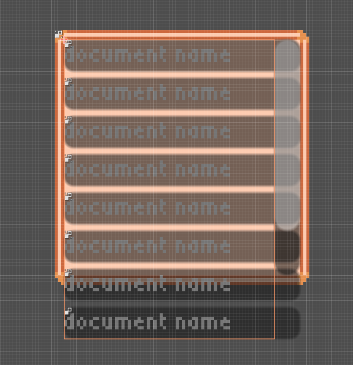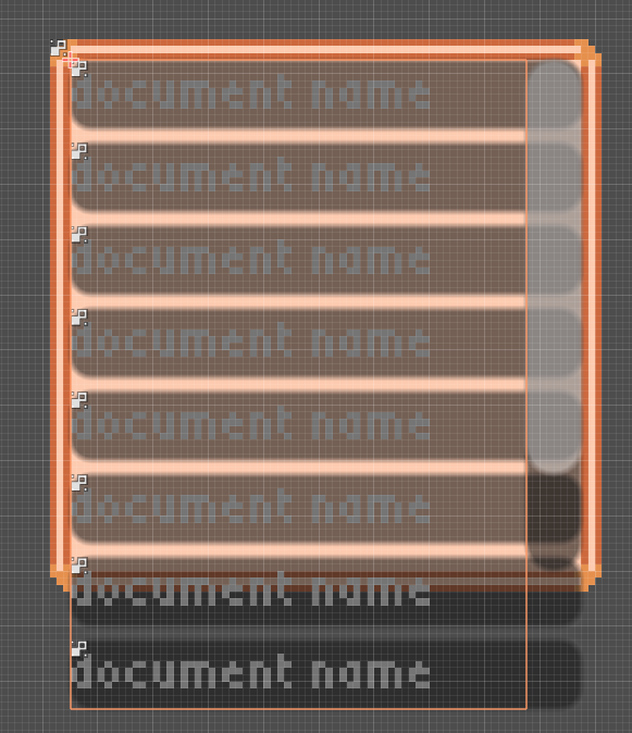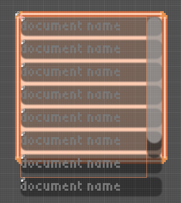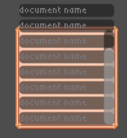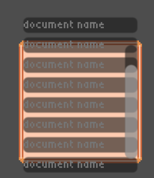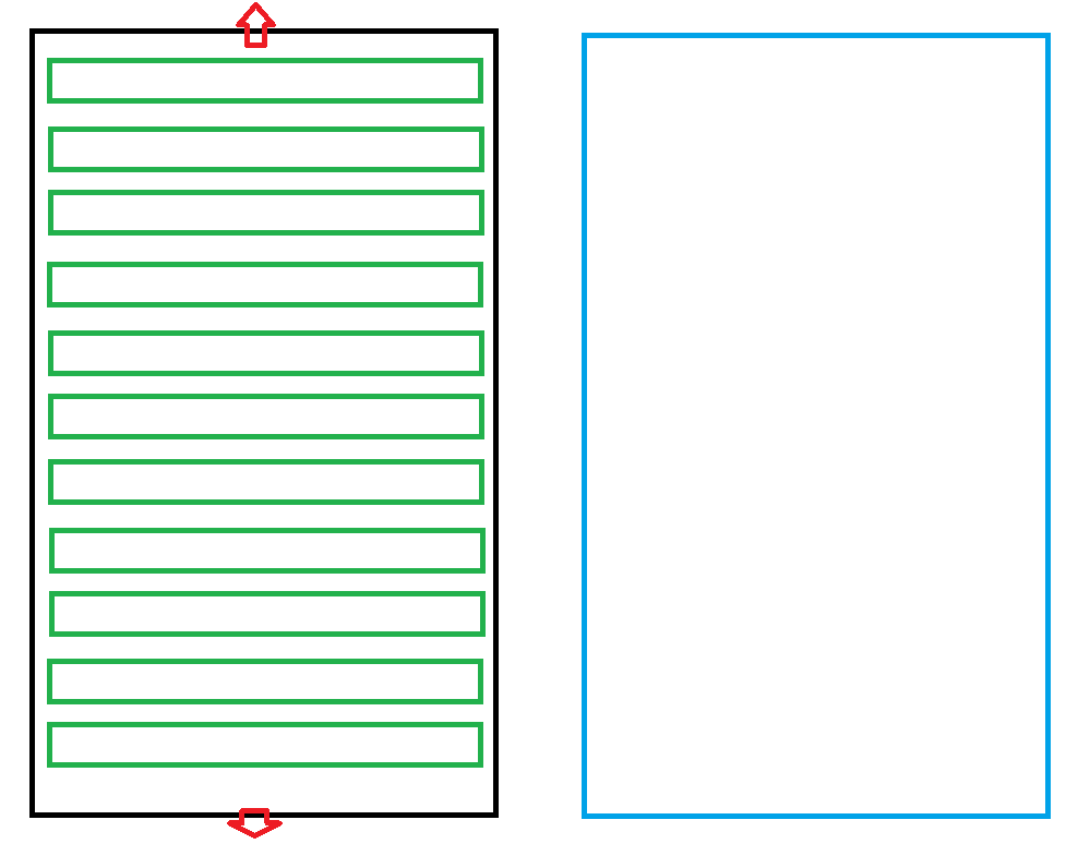 Есть черный прямоугольник слева (список документов). По мере нахождения записей туда добавляются документы. Зеленые прямоугольники - это названия документов. При добавлении они автоматом сортируются по названию. Т.к. документов планируется много, пространства внутри списка не хватит, чтобы отобразить сразу все документы - т.е. нужно будет листать список. При нажатии на документ текст отображается в синем прямоугольнике справа.