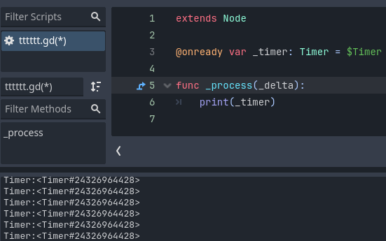 >>944317 Потому что ты обращаешься откуда-то из Init() или типа того, в общем, когда таймер ещё не создан. Потому и null. Так что ты так не делай. Видишь, годотечька на тебя ругается. Делай как положено: onready var my_timer = %Timer