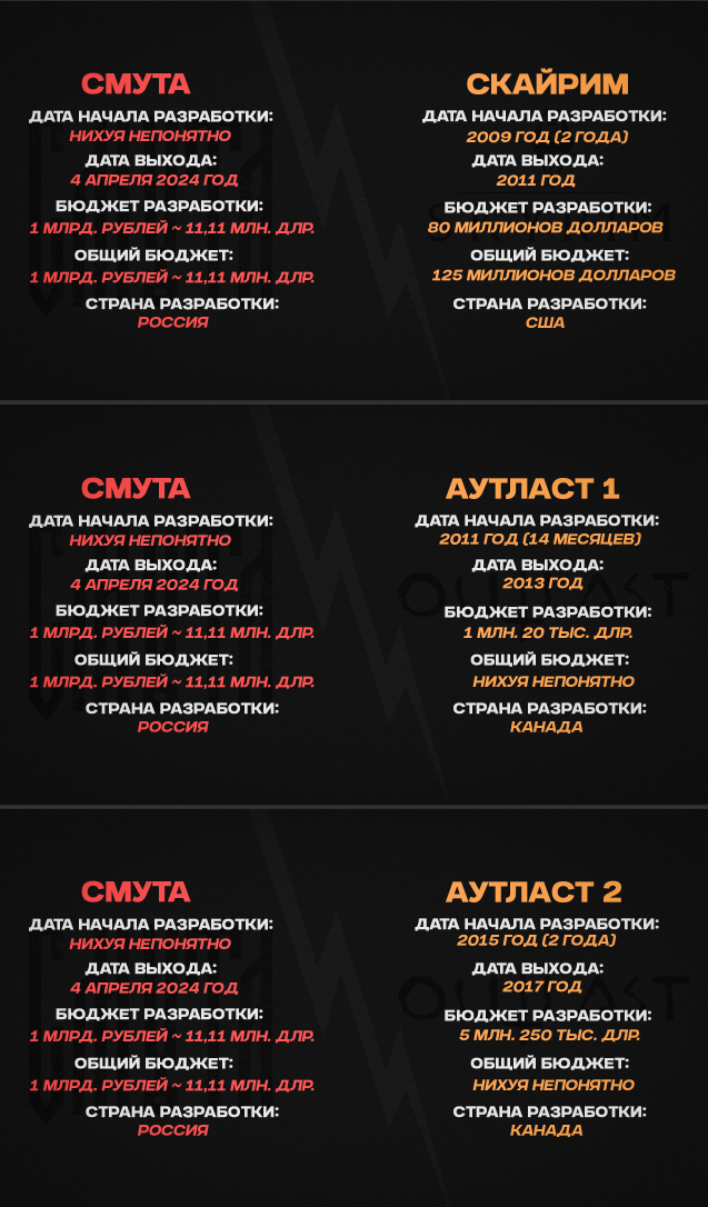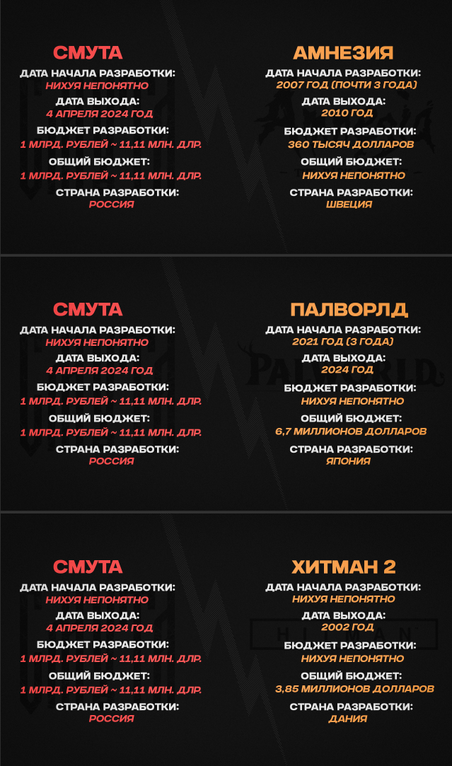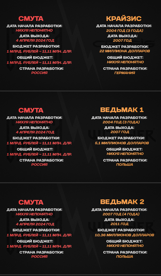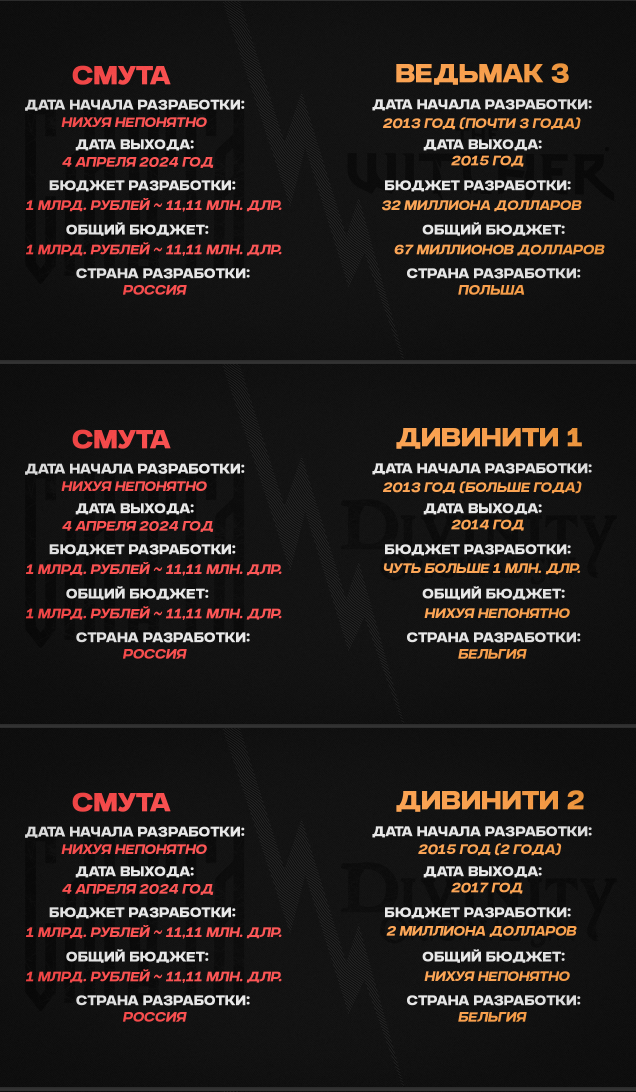>>944429 > Основная претензия к смуте - что она сделана за лярд Давайте сравним с другими игорами, сделанными за лярд дерева. Для объективности. Можно с переводом дерева в нефть, золото и другие типы монет. > из бюджета А потом уж будем обоснованно сокрущаться проёбом из нашего кармана.