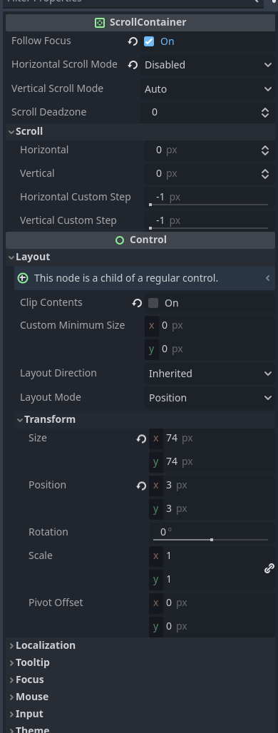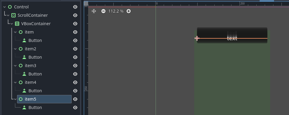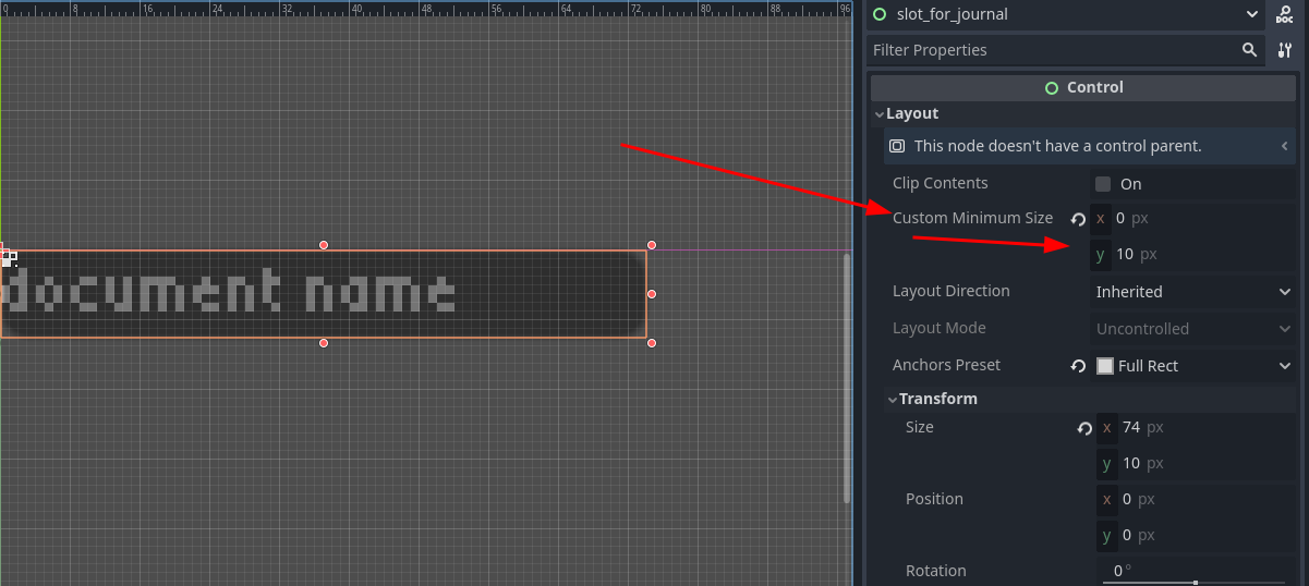>>944925 1 пик - вот что будет если "document name" поставить custom min size - 1 пиксель 2 пик - это custom min size - 10 пикселей separation при этом стоит 2 пикселя 3 и 4 пик - это custom min size у "document name" 0 + separation в контейнере 12. Как можно заметить на 4 пике есть тоненькая полосочка. Godot ее и считает за размер моего слота и прокручивает скролбар до нее. Соответственно сама ячейке не видна. А она у меня сейчас состоит из ноды Control с двумя дочками: button и label (временно)