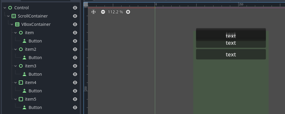 >>944938 >>944934 Да теперь ясно. Если у элемента контейнера нулевая высота (а у Control она нулевая, да), ты должен выставить высоту вручную, но это негативно скажется при масштабировании. Или измени контрол на любой контейнер. Вот как тут я последние два заменил на MarginContainer и они сразу правильно расположились.