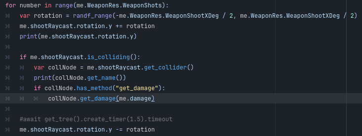 Сделал разброс для оружия, примитивный, зато хоть какой-то, но и он не работает. Путём проб и тестов понял что каким-то образом слишком быстро возвращаю поворот рейкаста в начальное положение и скрипт не успевает адекватно отработать, кто-то знает что с этим можно сделать(кроме таймера в полторы секунды)?